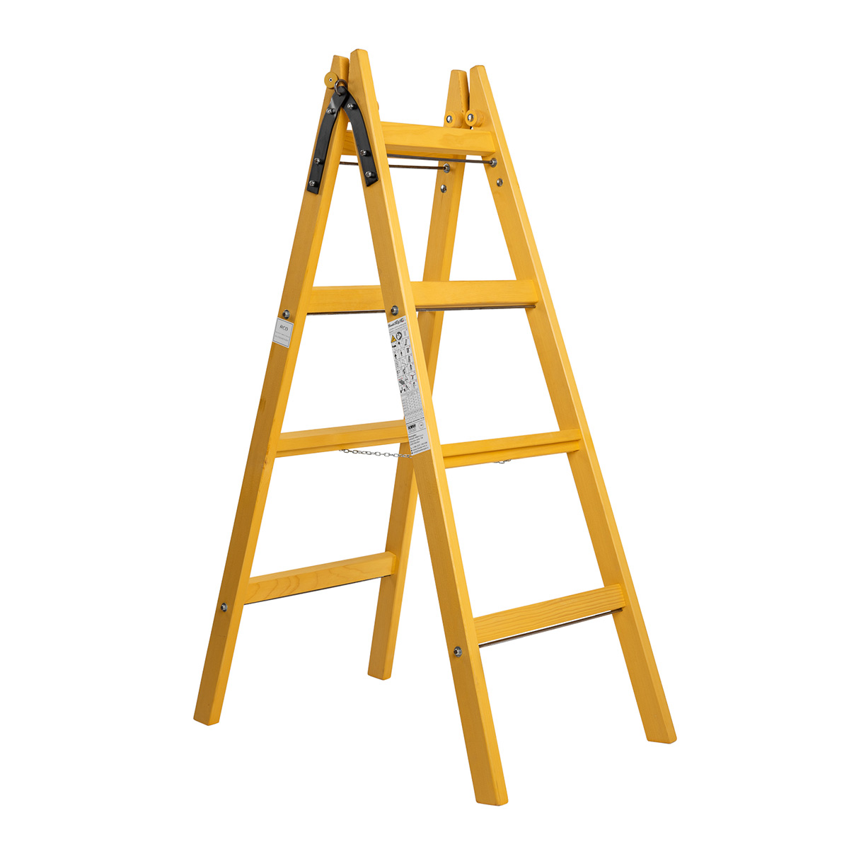 A-lestev A4 (4 stopnice). Delovna višina do 2,60 m, teža 6.8 kg, nosilnost 150 kg, slovenski les jelke/smreke, robustno okovje črno-mat, dolga življenska doba in stabilna konstrukcija. Skladno z EN 131 / ÖNORM Z 1501; EUIPO patentirano.