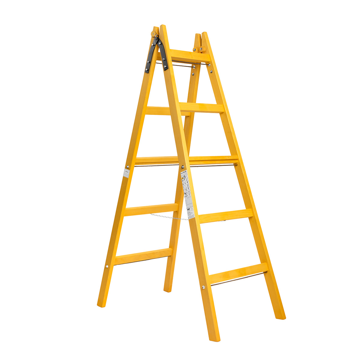 A-lestev A5 (5 stopnic). Delovna višina do 2,90 m, nosilnost 150 kg, teža 8 kg, slovenski les jelke/smreke, robustno okovje črno-mat, dolga življenska doba in stabilna konstrukcija. Skladno z EN 131 / ÖNORM Z 1501; EUIPO patentirano.